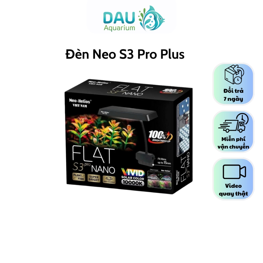 Giới thiệu ngắn – Đèn thủy sinh S3 ProNeo Helios Flat Nano S3 Pro là một lựa chọn tối ưu dành cho những người chơi hồ thủy sinh mini hoặc nano, mang đến vẻ đẹp sinh động nhưng vẫn giữ được tính tự nhiên của nước.Điểm nổi bật:Hệ LED RGB 3-in-1: Ánh sáng đa sắc nổi bật giúp cây và cá lên màu đỏ – vàng đẹp mắt mà không khiến nước bị ám màu. Công suất phù hợp & kích thước hợp lý: Phiên bản Pro thường là 13 W (S3 Plus) phù hợp hồ rộng 25-40 cm, với máng dài ~18.5–18.8 cm và chân đèn cao (~15 cm khi duỗi thẳng) . Bản S3 (8 W) thì phù hợp hồ 15-25 cm, máng dài ~11.7 cm .Thiết kế tiện lợi: Đèn dạng kẹp có thể điều chỉnh, dễ dàng cố định lên thành hồ kính có độ dày tối đa ~15 mm . Máng nhôm mỏng, màu đen mang lại vẻ tinh tế, gọn gàng .Hoạt động đơn giản: Chỉ có một nút bật/tắt duy nhất, hỗ trợ dùng với timer để tạo lịch chiếu sáng hàng ngày; không hỗ trợ điều chỉnh độ sáng hay qua ứng dụng. Chi phí hợp lý: Đây được xem là chiếc đèn “ngon bổ rẻ” nhất trong phân khúc giá thấp, phù hợp với trải nghiệm chơi thủy sinh cơ bản. Hiệu quả chơi thủy sinh: Đèn giúp cây phát triển nhanh, màu sắc lên đẹp, ổn định hệ vi sinh trong hồ. Chế độ bảo hành: Một số nguồn cho biết sản phẩm được bảo hành 6 tháng 1 đổi 1 nếu có lỗi do nhà sản xuất .