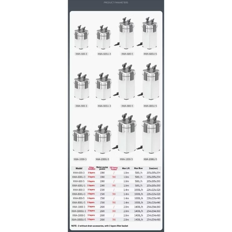 Dòng sản phẩm lọc thùng Sunsun Xiaoli XWA đến từ hãng Sunsun là một trong số những dòng sản phẩm mới với thiết kế đẹp và nhiều tính năng hay. Lọc Sunsun Xiaoli XWA không những rẻ, khỏe mà chất lượng phần cứng đã được tăng lên rất nhiều.- Lưu ý: Các mã lọc đuôi (-3) sẽ không có phần xả đáy, mọi người lưu ý nhé!Thông số sản phẩm Sunsun Xiaoli XWASunsun Xiaoli XWA 600-5- Lưu lượng: 500 lít/h- Đường kính ống: Fi 12- Công suất: 10W- Kích thước: 40x21x21Sunsun Xiaoli XWA 800-5- Lưu lượng: 1000 lít/h- Đường kính ống: Fi 16- Công suất: 15W- Kích thước: 46x24x24Sunsun Xiaoli XWA 1000-5- Lưu lượng: 1400 lít/h- Đường kính ống: Fi 16- Công suất: 26W- Kích thước: 48x26x26Ưu điểm của lọc Sunsun Xiaoli XWAChất lượng sản phẩm- Điểm đầu tiên mình cần chia sẻ đó chính là chất lượng sản phẩm so với người đàn anh đi trước chính là lọc Sunsun HW, khi mình cầm vào sản phẩm thì phải khẳng định một điều đó chính là chất lượng gia cộng, chất lượng nhựa và thiết kế của Sunsun Xiaoli đã tốt hơn rất nhiều so với người đàn anh tiền nhiệm.- Cảm giác chắc chắn hơn, cứng hơn và đàm tay hơn, khiến sản phẩm có cảm tình hơn và thể hiện được chất lượng từ sản phẩm.Thiết kế- Nói về thiết kế sản phẩm,thẩm mỹ sẽ hơi khó để khen hoặc chê, nhưng nhìn chung dòng sản phẩm mới Xiaoli có thiết kế đẹp hơn và độc đáo hơn bản tiền nhiệm, cảm giác tinh tế hơn với thiết kế không quá rườm già nhưng vẫn thẩm mỹ.Tính năng- Hệ thống lọc cực tốt với 3 lớp – 5 khay lọc, giúp bạn có tăng cường hệ thống lọc của bạn tốt hơn.- Với nhiều khay lọc hơn, bạn có thể xếp được nhiều tầng vật liệu lọc hơn và tùy biến theo yêu cầu bản thân tốt hơn.- Với tính năng có thể khóa dòng ở đầu IN và đầu OUT riêng biệt sẽ giúp mọi người tùy chỉnh được chiếc lọc của mình dễ dàng hơn và hiệu quả hơn.- Một trong những tính năng ấn tượng nhất của dòng lọc này chính là tính năng có thể xả được phần đáy lọc thùng, điều này giúp chúng ta có thể loại bỏ được rất nhiều cặ hoặc tạp chất đang ở trong chiếc lọc của mình, từ đó giúp giảm lượng chất thải và tăng cường được công suất lọc của hệ vi sinh trong lọc.- Tính năng hỗ trợ mồi nước cũng là một ưu điểm cực kỳ hữu ích. Như chúng ta từng biết thì các dòng lọc thường phải đổ đầy nước vào lọc để có thể hoạt động. Trong một vài trường hợp chúng ta không thể đổ đầy nước trong lọc được và việc có thêm tính năng mồi nước này sẽ giúp chúng ta có thể đổ đầy nước vào trong lọc mà không cần phải tháo đầu In hoặc Out ra.Note: Bản thường không có UV sẽ không có nút bấm#phukienthuysinh #sunsun #locthung #locthungbeca #sunsunxiaolixwa #locbeca #lochoca #locthungthuysinh #locsunsun